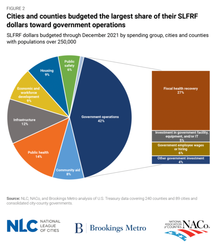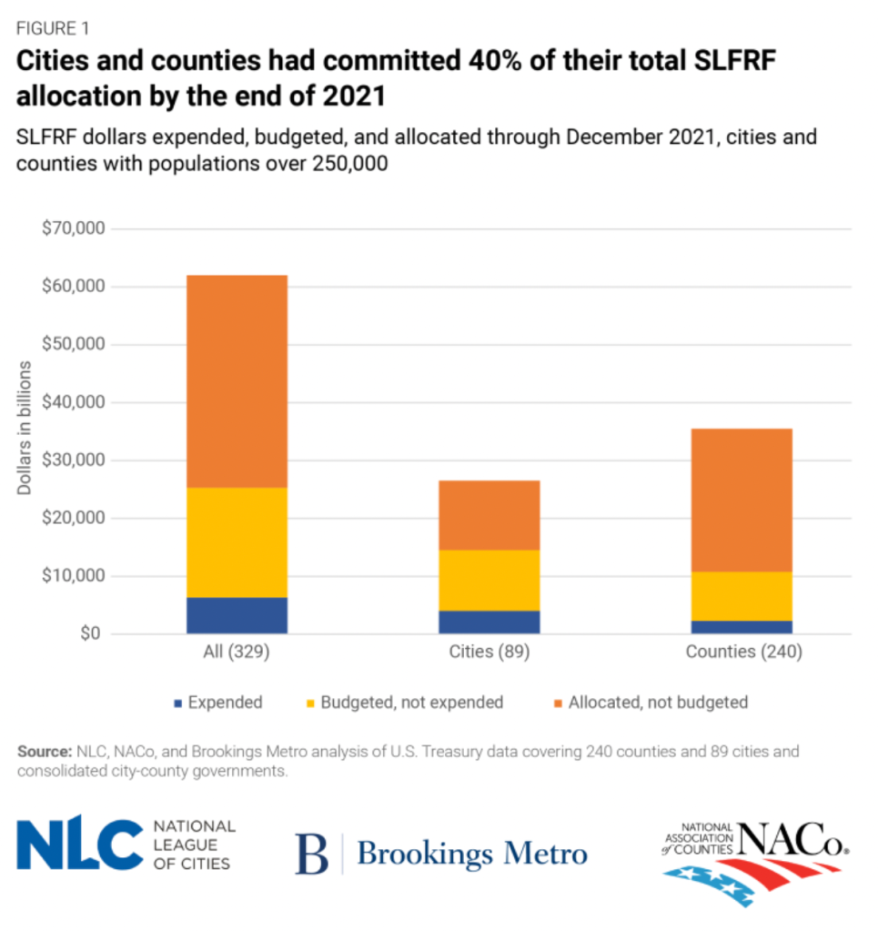Using the latest available government data, the report found that the 329 large cities and counties that received State and Local Fiscal Recovery Funds had by December 2021 allocated 40% of the $62 billion distributed over the first two years of the program.