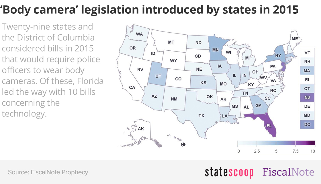 State legislatures saw an explosion in the number of bills introduced involving body cameras for police officers in 2015, according to a StateScoop analysis of legislative activity, using a database developed by FiscalNote.