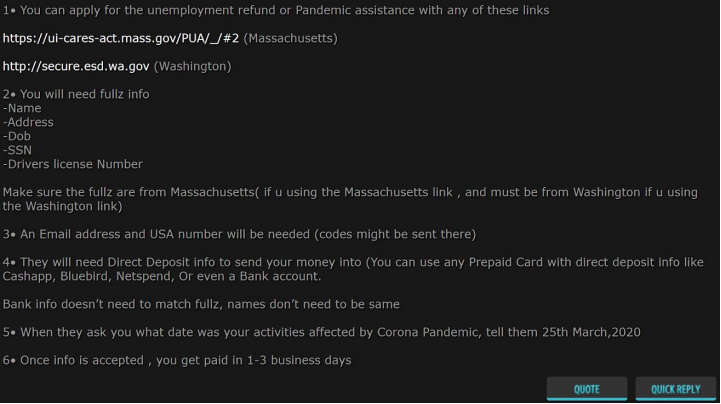 One message captured from a criminal forum shows instructions of how to apply for fraudulent claims in Washington and Massachusetts. The poster helpfully includes URLs for those states’ unemployment agencies, the pieces of personal information needed to file and how to get the money via direct deposit, including to prepaid debit cards. The post even tells would-be scammers how to describe their non-existent hardships.