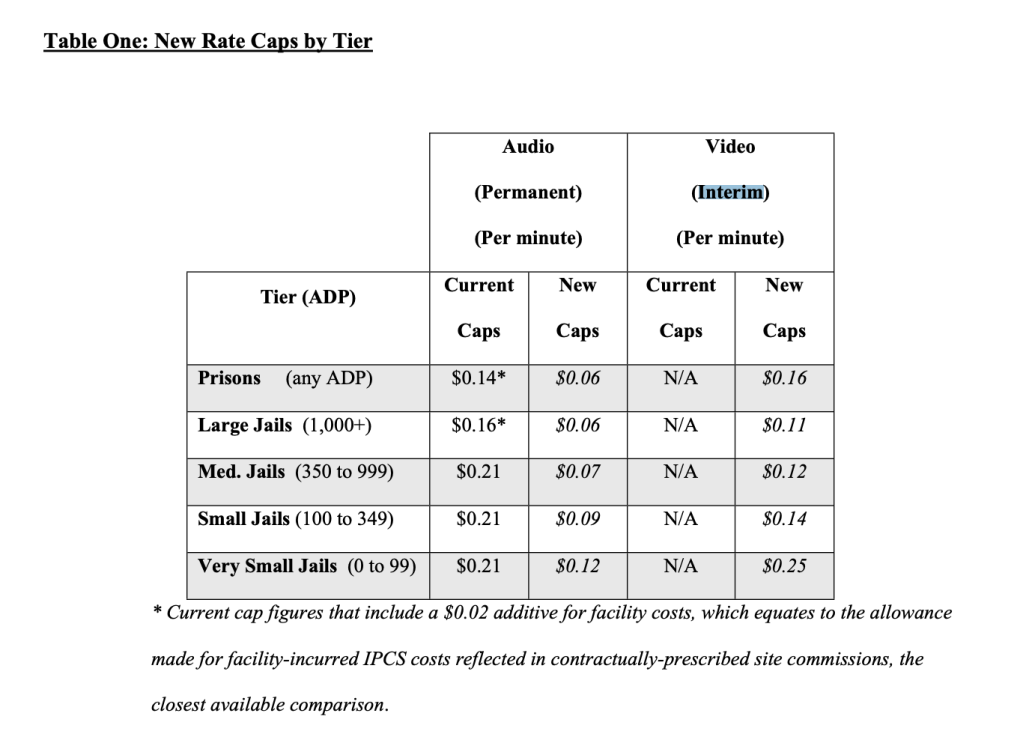 The rate caps are broken down by institution size and type. Prisons, and jails with populations of at least 1,000, will be capped at $0.06 per minute for audio calls, compared to the current cap of $0.14 per minute and $0.16 per minute, respectively. New rates for “medium” to “very small” jails range between $0.07 and $0.12 per minute, compared to the current cap of $0.21.