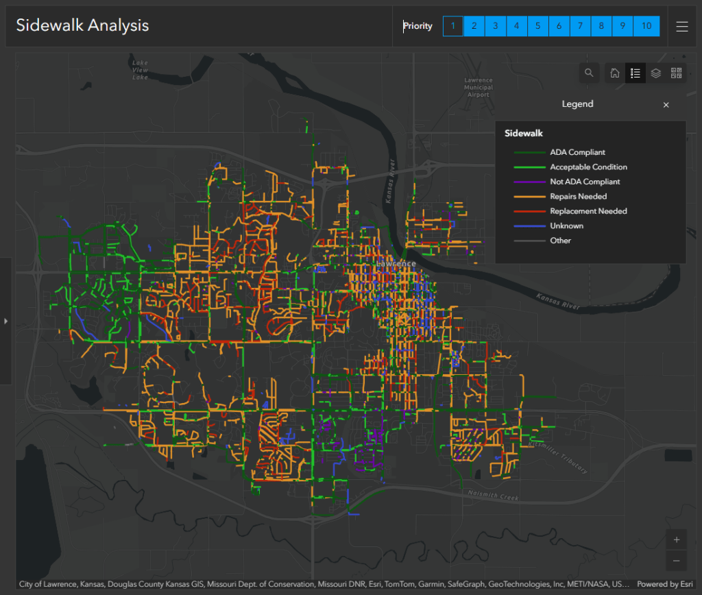 The layered datasets also allowed the public to become more engaged in the process, said Jessica Mortinger, Lawrence’s transportation planning manager. She said that was important because, in Kansas, some property owners are required to maintain their own sidewalks.