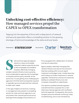 A new report, “Unlocking cost-effective efficiency: How managed services propel the CAPEX to OPEX transformation,” produced by Scoop News Group, for StateScoop, and sponsored by Spectrum Enterprise, explains why investing in managed services has emerged as a compelling solution for agencies, providing enhanced network performance and access to skilled network and security specialists.
