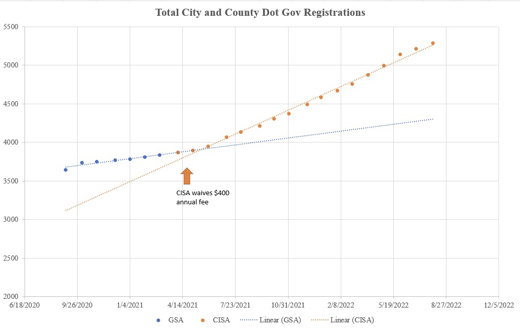 In taking over .gov, CISA was given a mandate to increase adoption among local governments, many of which still use domains ending in .com or .org. One of the first things CISA did was waive the $400 annual fee that GSA previously charged .gov registrants.
