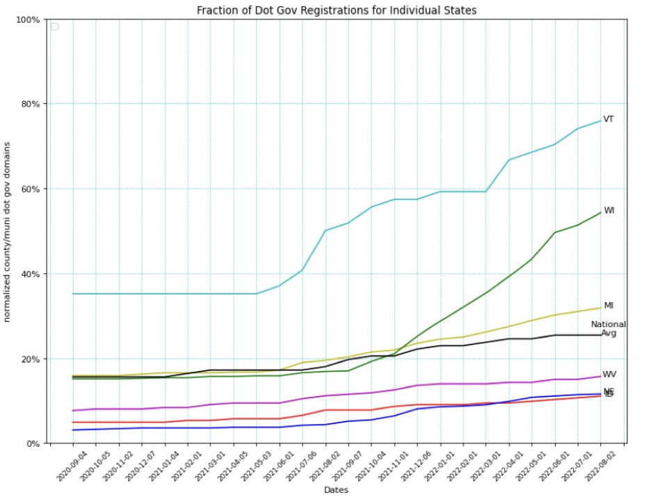 If we look at the growth rate for individual states, most of them are on the same slow annual increase that we see for all states combined. But there are a few states that have an abrupt bend where the adoption rate accelerated. I’ve labeled and color-coded the six states that had the largest percentage increase in registrations since September 2020: Nebraska (+279%), Wisconsin (+260%), Idaho (+125%), Vermont (116%), West Virginia (105%), and Michigan (+100%). By comparison, the average increase across all cities and counties in that time period was 45% (from 3,642 to 5,287). Each of the featured states’ adoption rates are scaled so that 100% means each city and county in the state has registered one domain.
