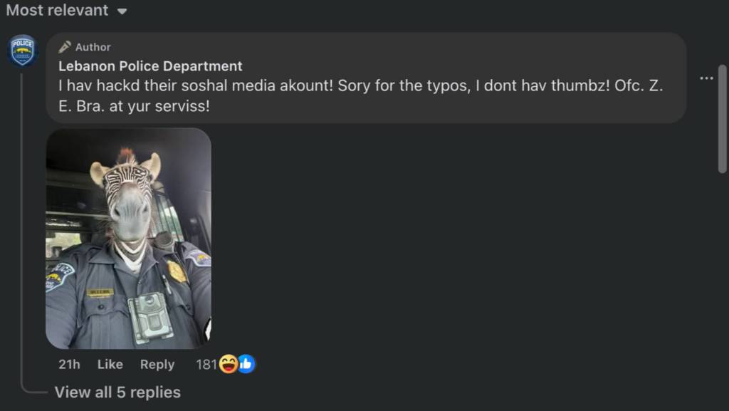 A Facebook post from Lebanon Police Department welcomes its newest “high-speed recruit: Officer Z. E. Bra.”