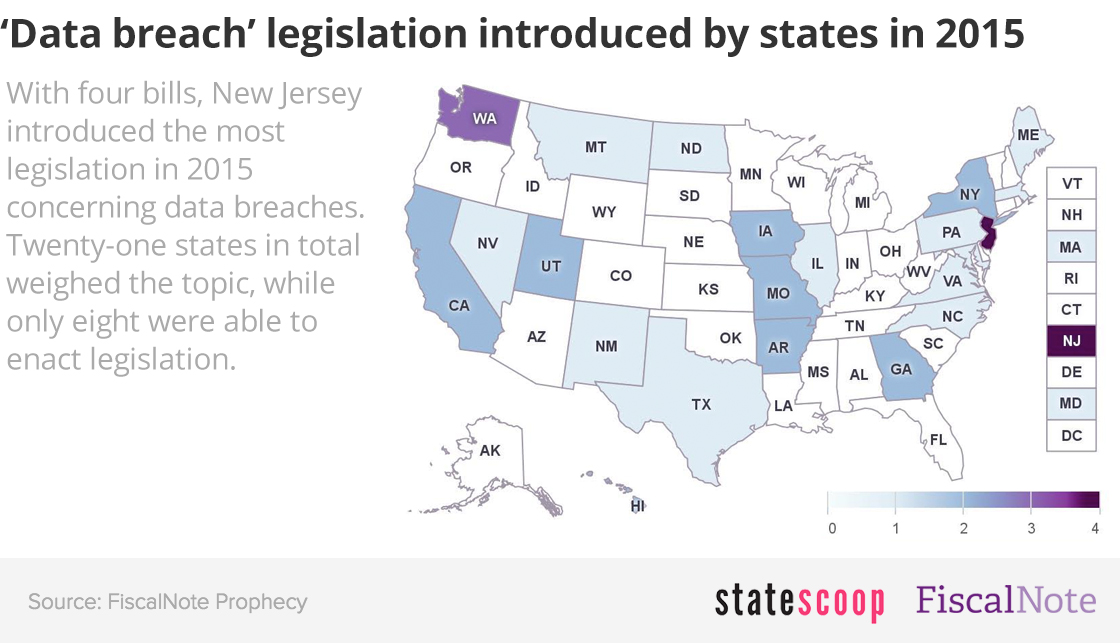 Along similar lines, state legislators also introduced dozens of bills in 2015 involving cybersecurity failures. In all, lawmakers in 21 states introduced 35 bills involving data breaches, according to FiscalNote’s database. That total is on par with 2014’s totals, when legislators in 13 states put forward 31 bills on the topic.