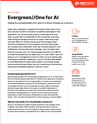 Artificial intelligence demands scalable, high-performance storage—but traditional solutions can’t keep up with AI’s unpredictable growth. Pure Storage Evergreen//One for AI eliminates storage bottlenecks with an SLA-driven, Storage-as-a-Service model designed specifically for AI workloads. Whether you’re training complex models or scaling GPU-intensive applications, this solution guarantees seamless performance, energy efficiency, and predictable costs.