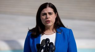 Colorado Secretary of State Jena Griswold speaks to reporters outside the U.S. Supreme Court on February 8, 2024 in Washington, DC. (Photo by Julia Nikhinson/Getty Images)