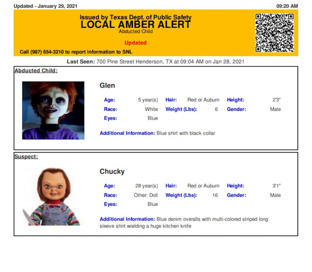 The alert, which went out three times on Jan. 29, named Chucky as a suspect in the kidnapping of Glen, another character from the films. The alert described Chucky as 28 years old, 16 pounds, wearing blue denim overalls and wielding “a huge kitchen knife.”